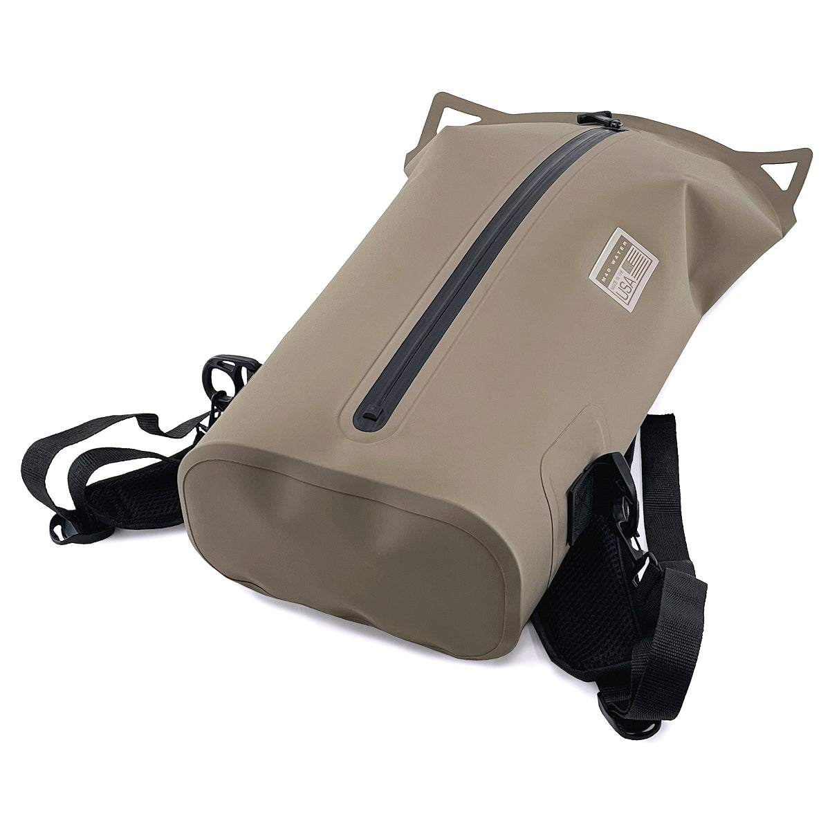 The Burton Waterproof Backpack features an air-tight fully submersible zipper, just like our waterproof duffel bags. And of course, we manufacture this waterproof backpack here in the USA. Each of these waterproof backpacks is RF-welded of double-coated polyurethane for extreme durability and excellent waterproof performance. Beyond the submersible waterproof zipper with T-handle, each backpack also features adjustable padded shoulder straps with an adjustable sternum strap, a nylon carry handle, and top corner accessory slots.