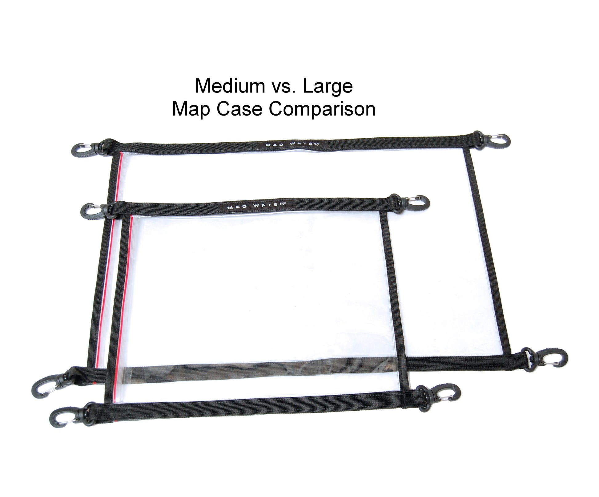 The Large Mad Water Waterproof Map Case at 12” x 18” will hold two pages side-by-side, an open map book, or a quarter of a typical 1:24,000 Topo Quad map.